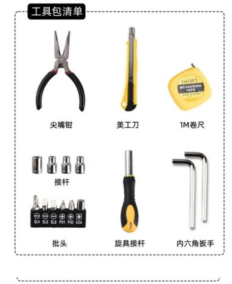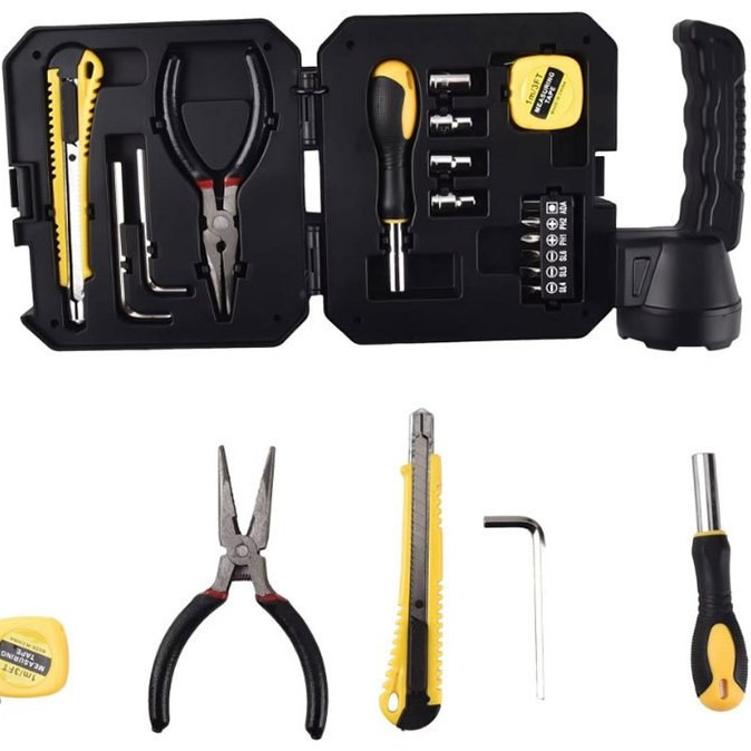 ١۶ قطعه ابزار کاربردی: شامل دمباریک، متر، آچار آلن، دسته و سری پیچگوشتی، سری آچار بکس، کاتر و…